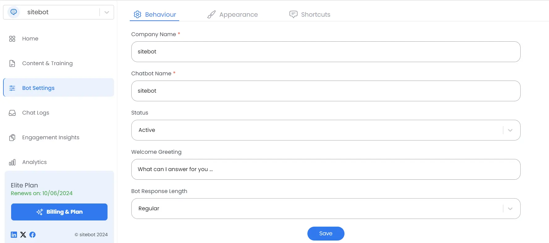 Review and Edit Attributes: During scanning, attributes such as chatbot name, company name are automatically collected. You can check and edit these details by clicking on Bot Settings in the left navbar and then clicking on the Behavior tab.