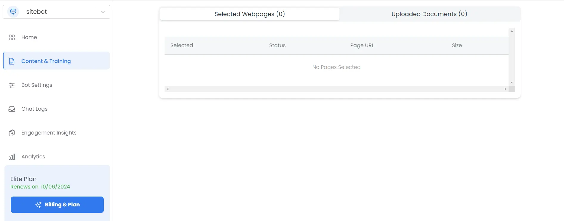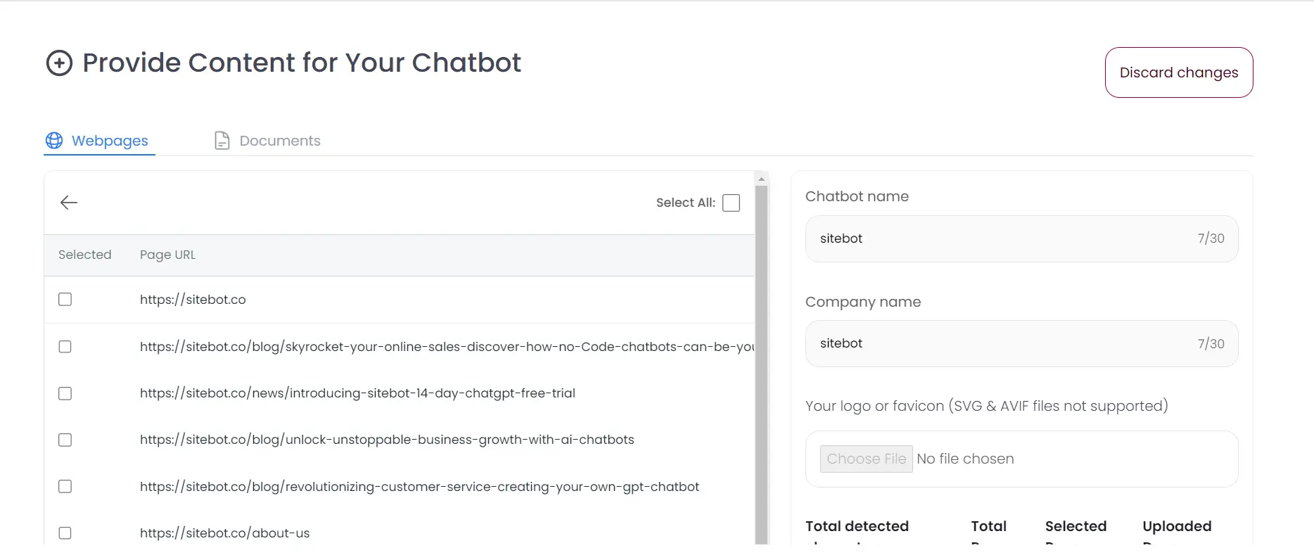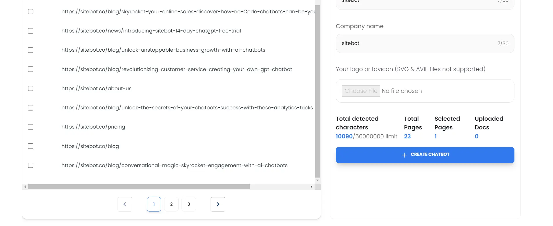 - Once your website is scanned, click on Select Pages for Training, you'll be able to see all the pages sitebot discovered from your sitemap, at this point, you can select or deselect specific pages for training.