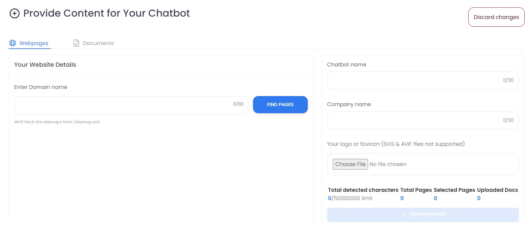 - On the "Provide content for your chatbot" page select the webpages tab at the top (selected by default). You can also click on the "Documents" tab to add documents from your knowledge base.