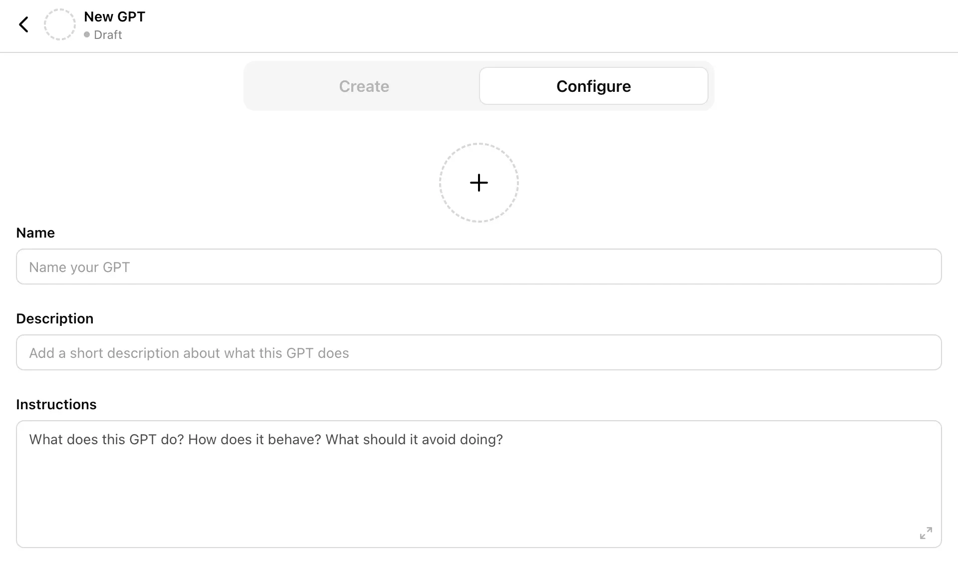 - Click the "+ Create." button in the top right-hand corner. This will cause the GPT builder page to open, allowing you to begin configuring your Custom GPT.